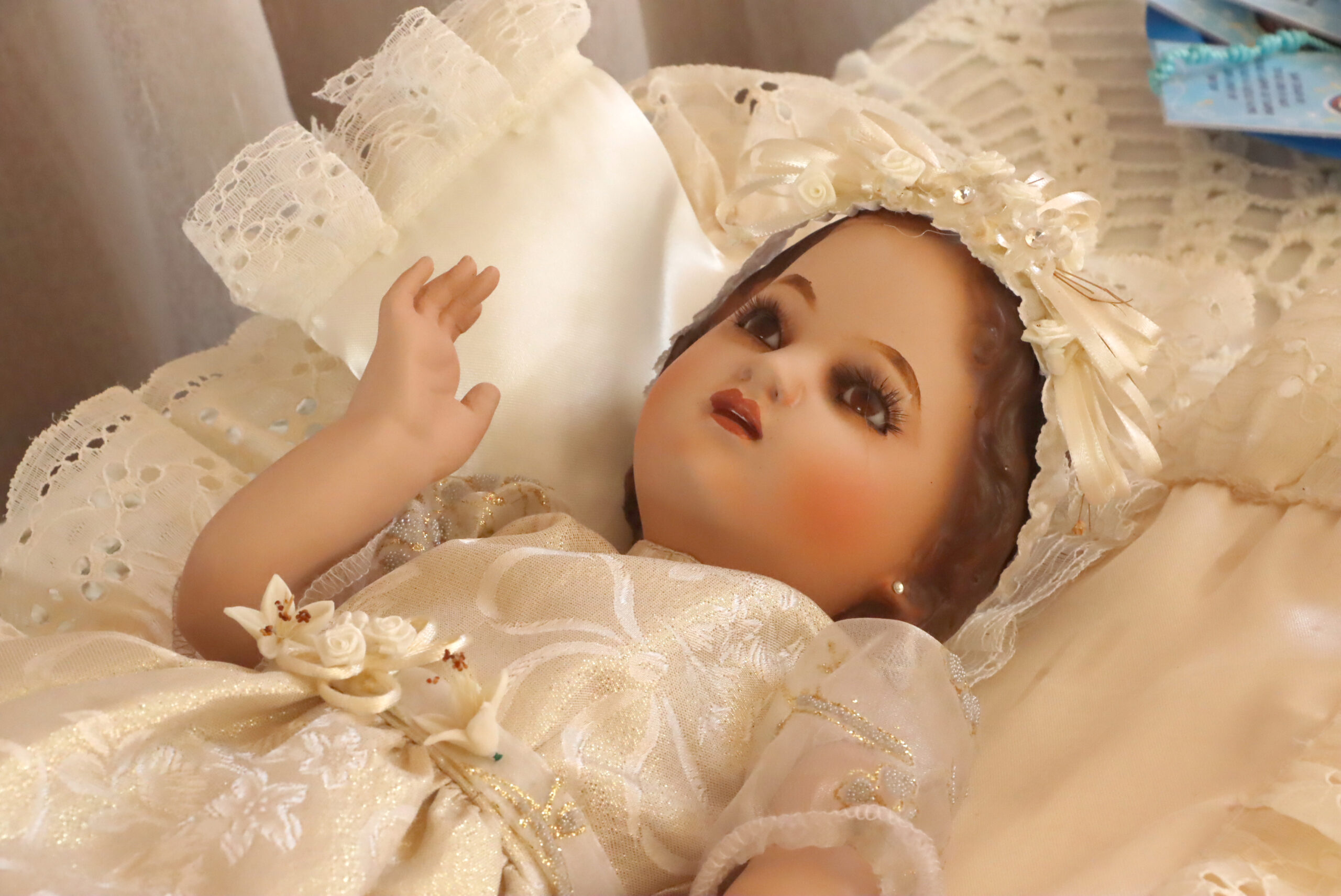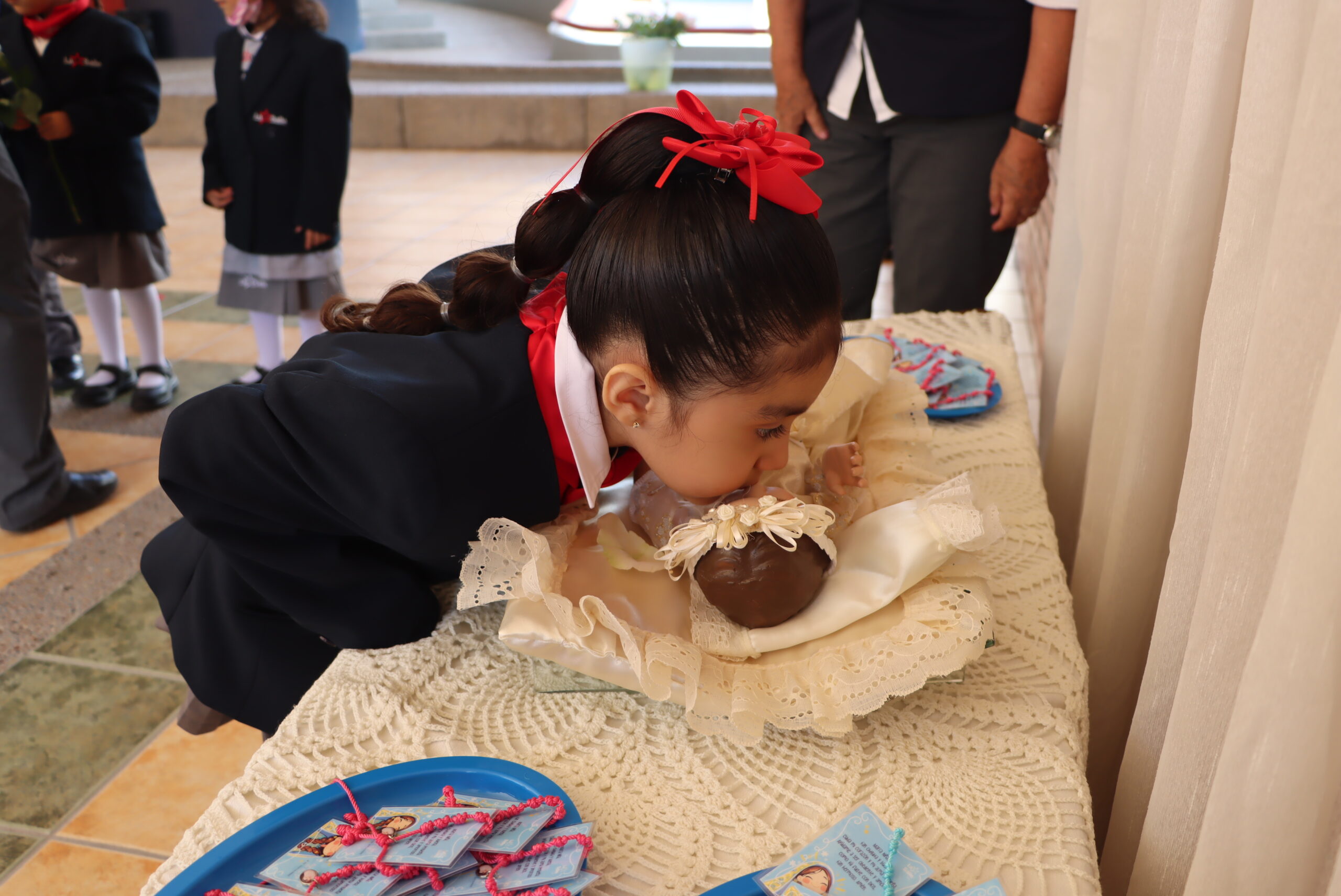 Durante la celebración, el Padre bendijo los decenarios con la medalla de la Niña Virgen y enseñó a los niños una breve oración, alentándolos a rezarla con amor y confianza. Como signo de cariño, los pequeños entregaron a la Virgen dos regalos: una flor y una oración.